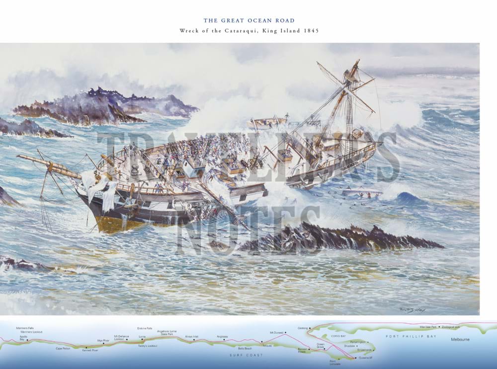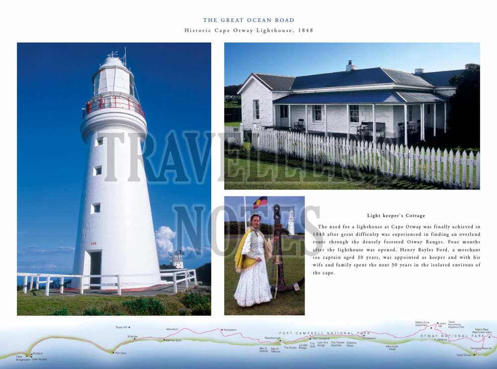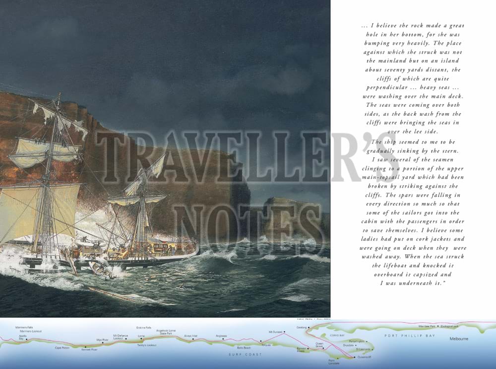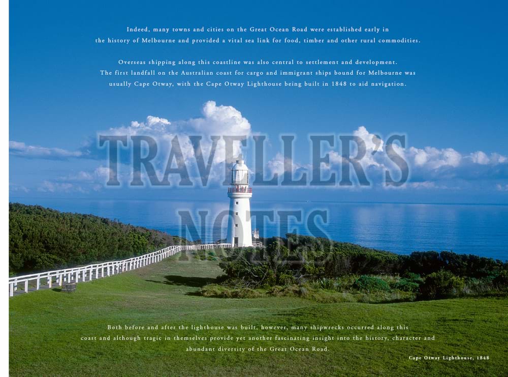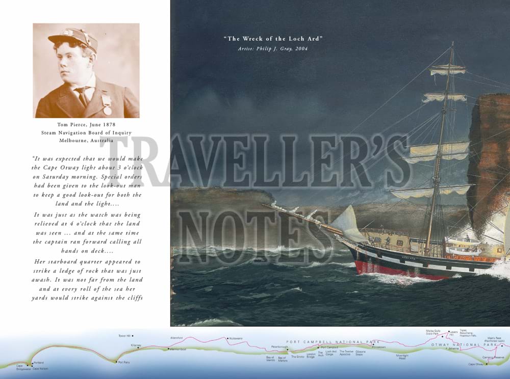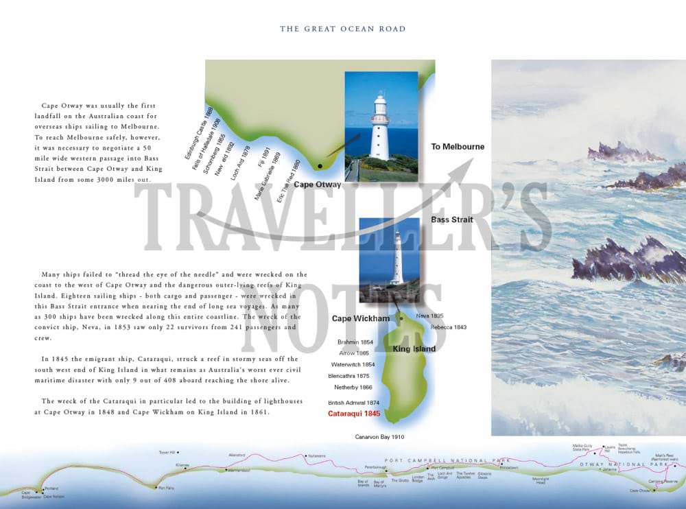 The book features in particular important aspects of the maritime history of the Great Ocean Road, including Cape Otway Lighthouse and paintings of well-known shipwrecks along the coast which have been specially commissioned for the book. These include the Loch Ard shipwreck at Port Campbell, the Fiji at Moonlight Head, the Schomberg at Peterborough and the wreck of the emigrant ship, Cataraqui, prior to the lighthouses being built at both Cape Wickham and Cape Otway.