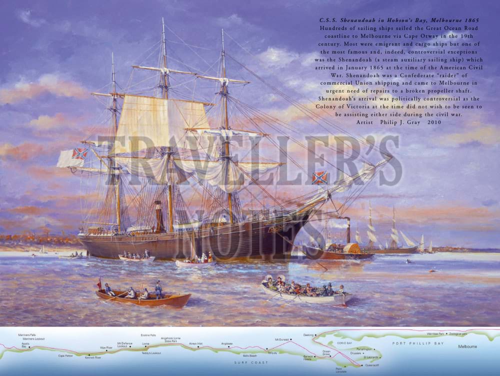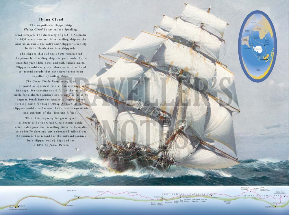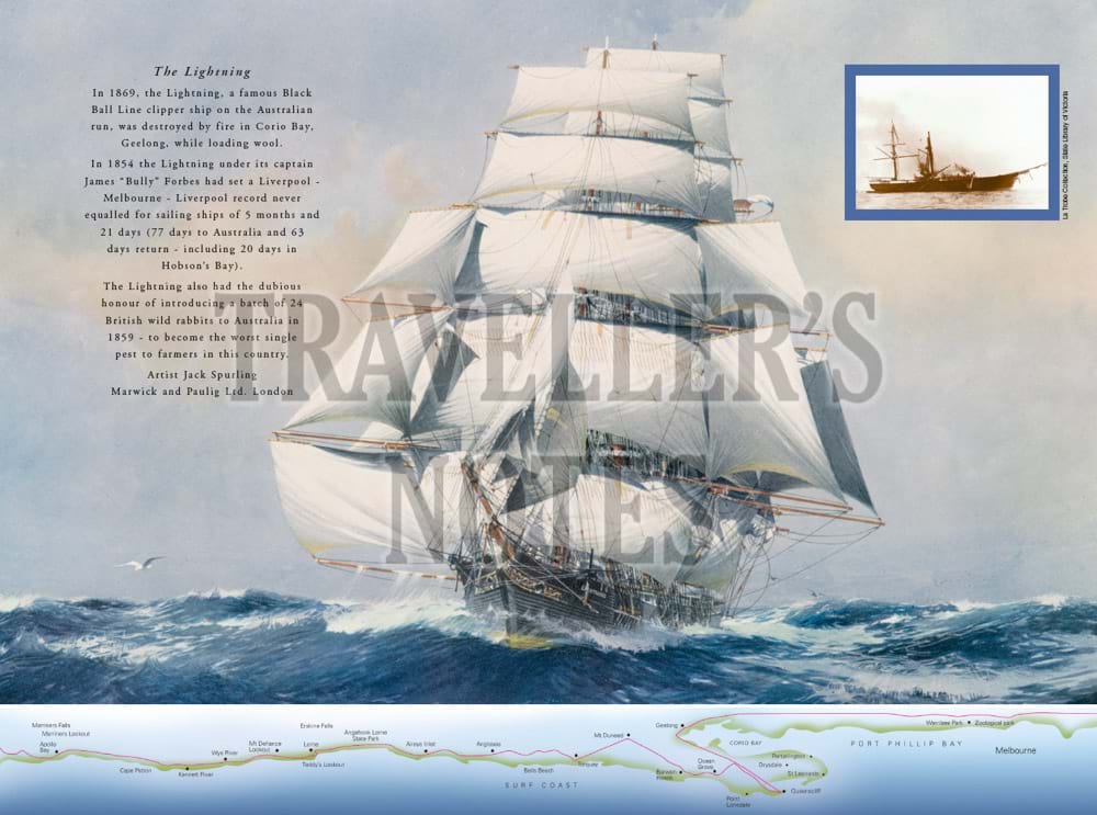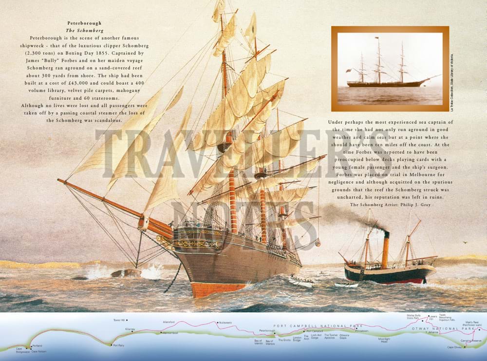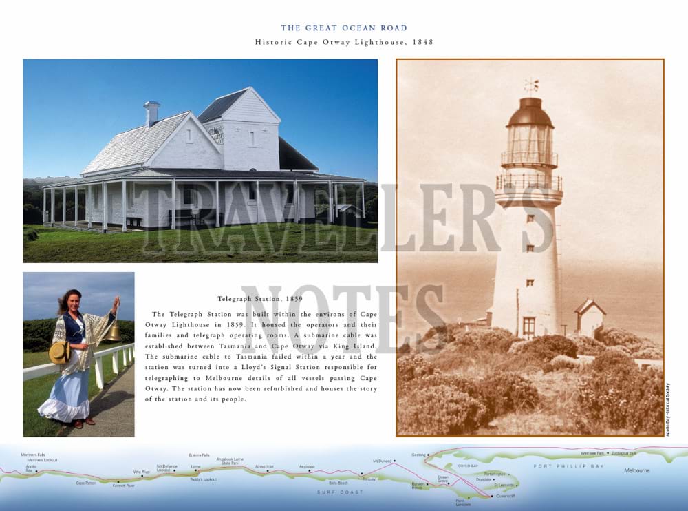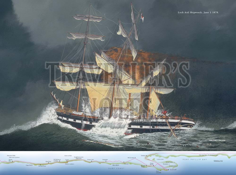 The book features in particular important aspects of the maritime history of the Great Ocean Road, including Cape Otway Lighthouse and paintings of well-known shipwrecks along the coast which have been specially commissioned for the book. These include the Loch Ard shipwreck at Port Campbell, the Fiji at Moonlight Head, the Schomberg at Peterborough and the wreck of the emigrant ship, Cataraqui, prior to the lighthouses being built at both Cape Wickham and Cape Otway.