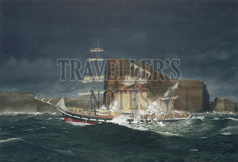 The Loch Ard was an iron-hulled clipper ship of 1,693 tons, 263 feet in length and with masts 150 feet high. It had left Gravesend, England on 2 March, 1878 with a general cargo and 54 passengers and crew aiming to return from Australia with wool and wheat. The ship became wrecked in the early hours of June 1, 1878 when it hit a reef extending out from Mutton Bird Island near Port Campbell on the Great Ocean Road. Of the 54 souls aboard only two survived: Tom Pierce, an apprentice crewman, and Eva Carmichael, a passenger. Both were aged 18 years and were washed into what is now called Loch Ard Gorge. Eva had been travelling to Australia with her parents, three sisters and two brothers. All seven died in the wreck.